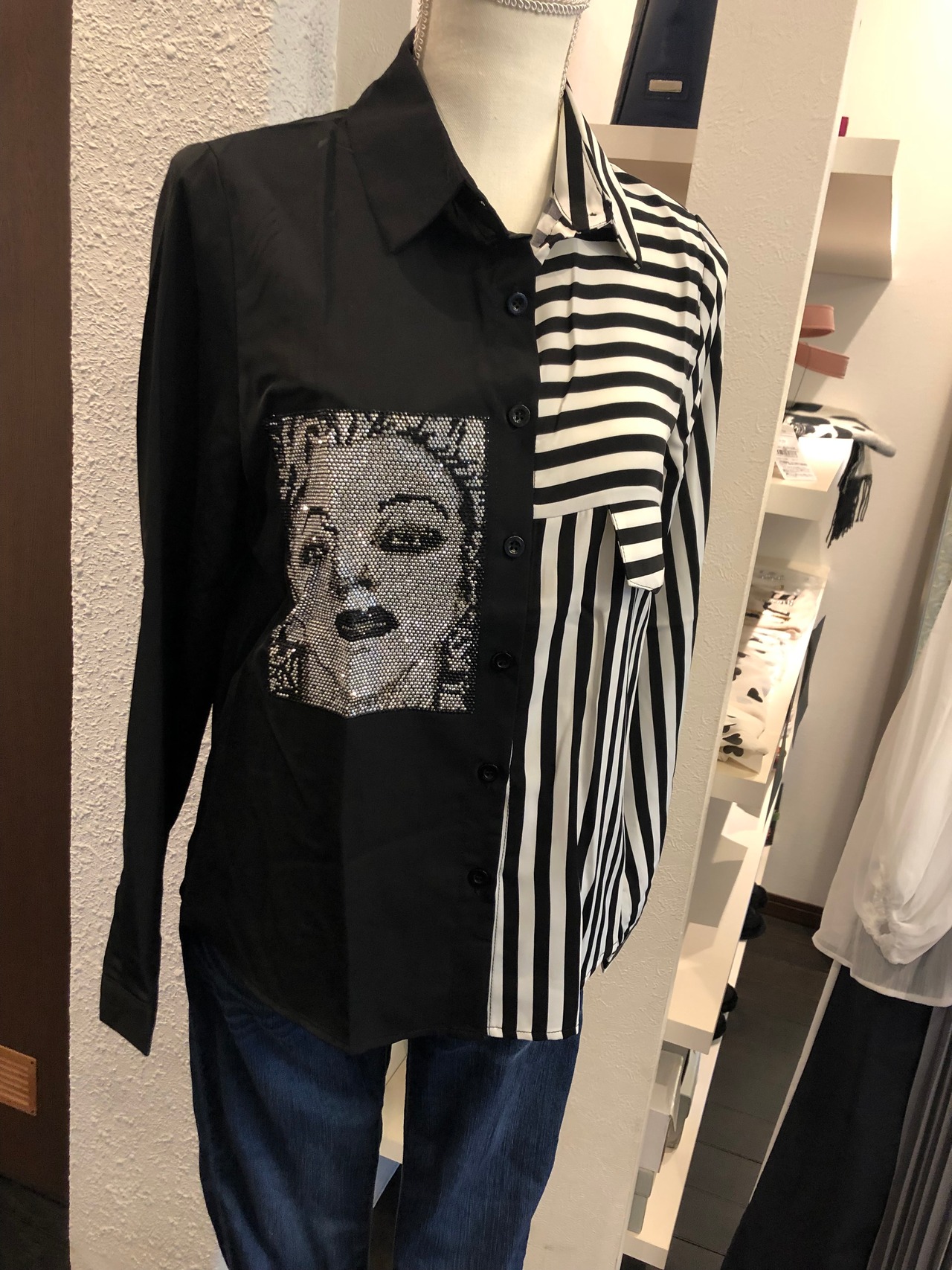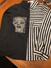 キラキラプリントアシンメトリーストライプシャツ