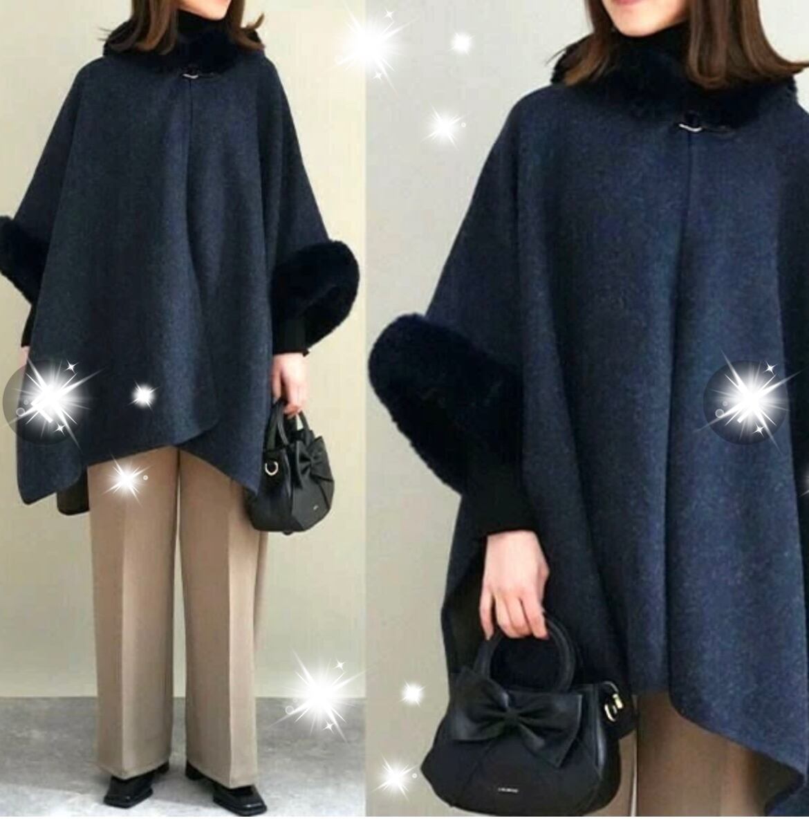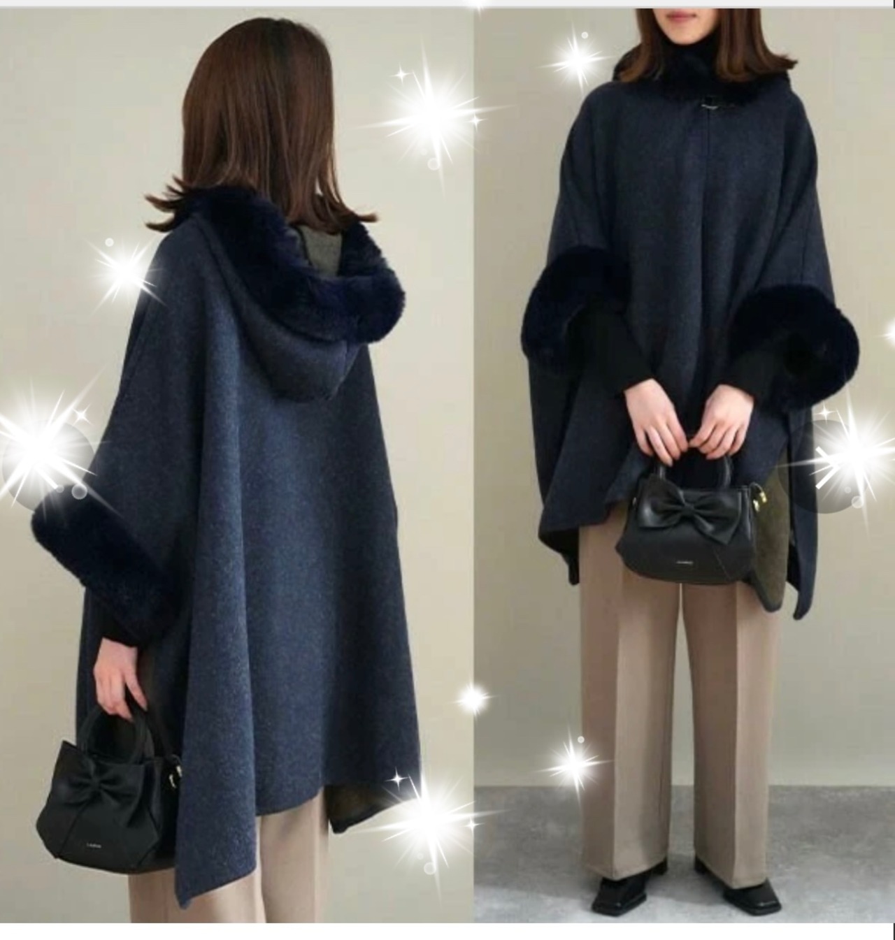 このポンチョは、軽やかな着心地を考慮したシルエットで、動きやすさも抜群です。一枚羽織るだけで、コーディネートがぐっとスタイリッシュに仕上がります!特に、ファートリミングが全体の印象を引き締め、あなたのスタイルに華やかさを加えます。